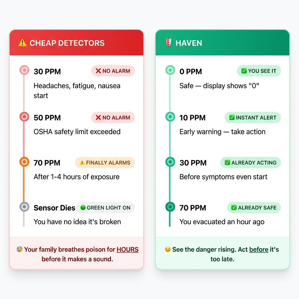 Most detectors only show a green light — which stays on even when the sensor is dead. They don't alarm until 70 PPM, which is AFTER 1-4 hours of exposure. Haven shows you real-time levels from 0 PPM on a digital display. You see the truth, not a light that lies.