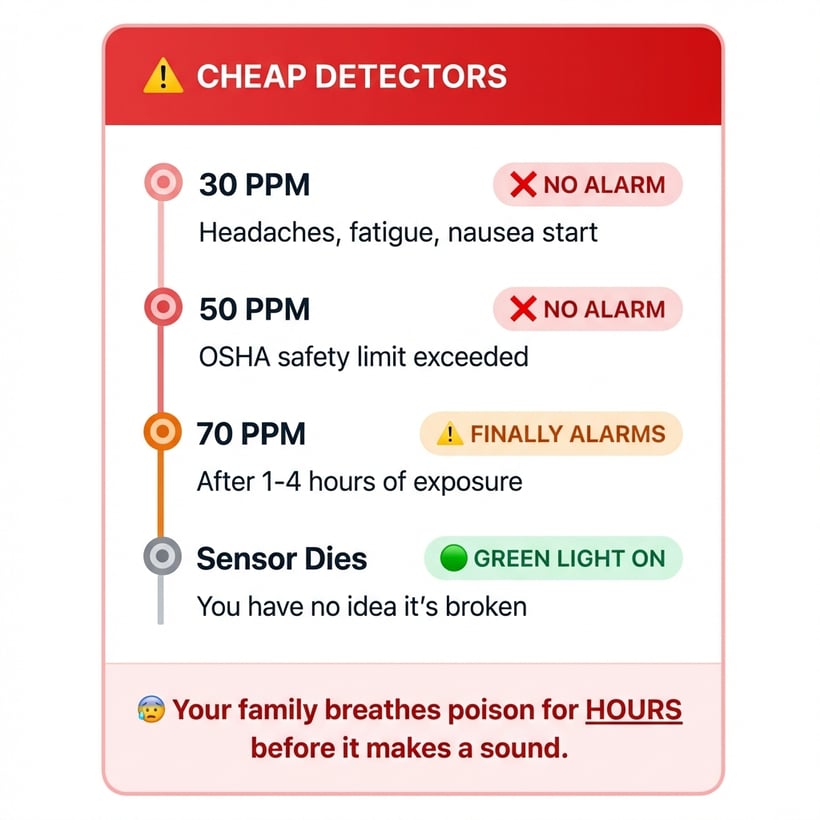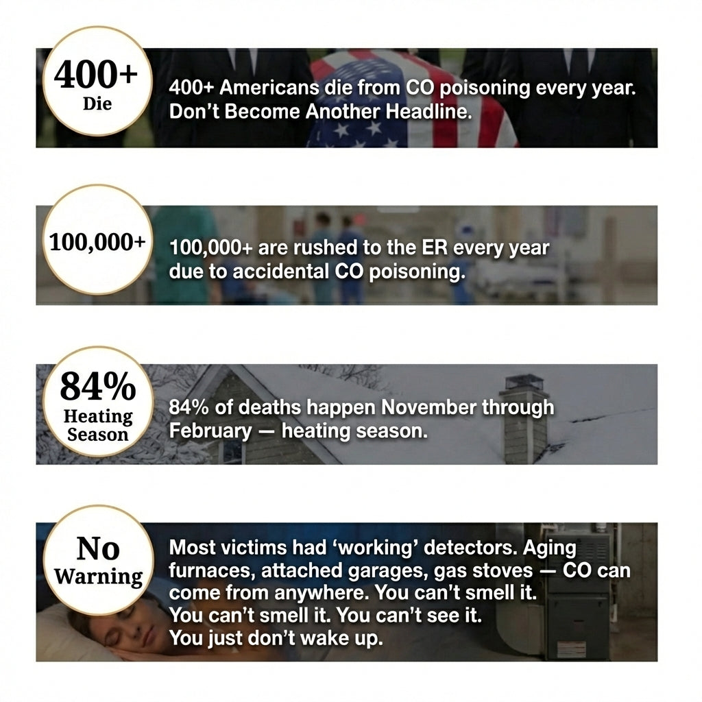 Every year, over 400 Americans die from CO poisoning most of them while sleeping. The tragedy? Almost every victim had a "working" detector on their wall. Green light glowing. Silent.
